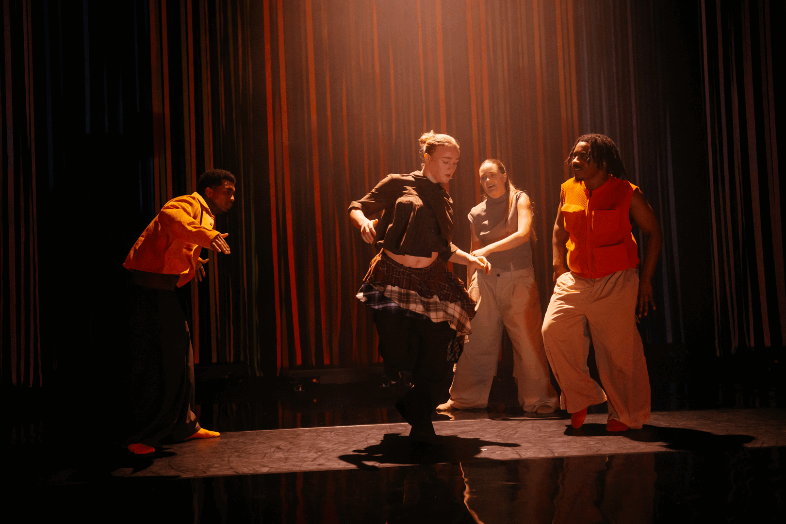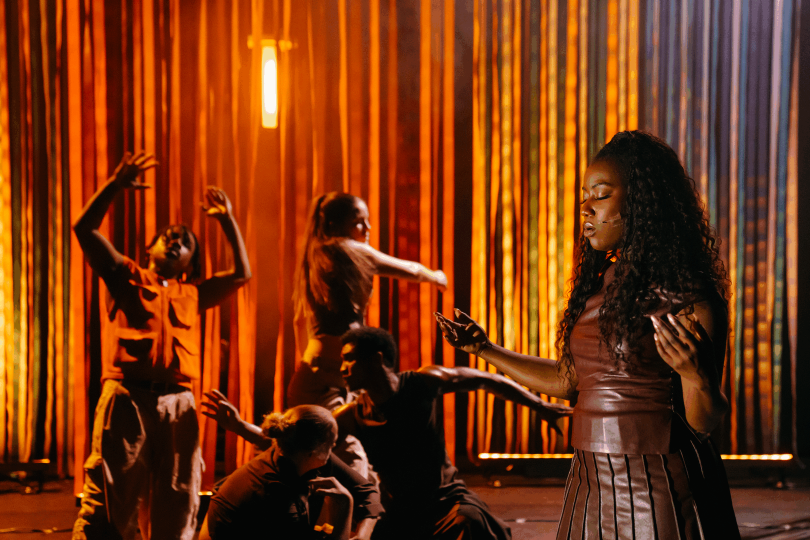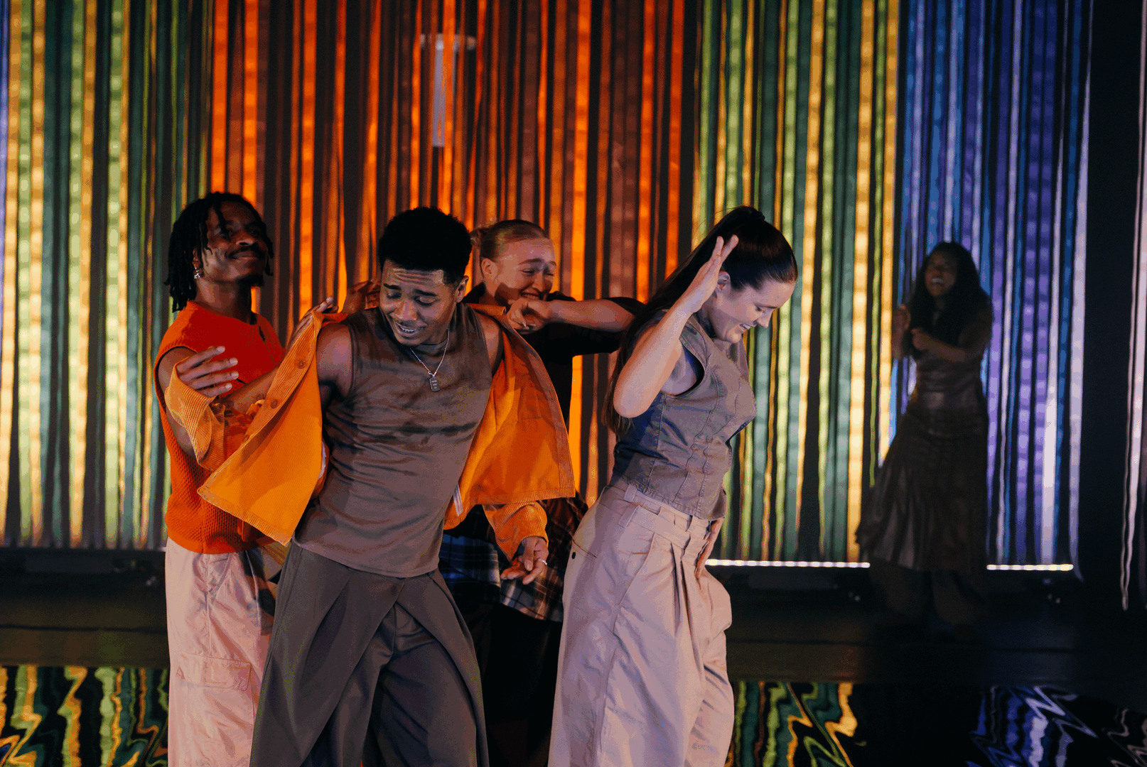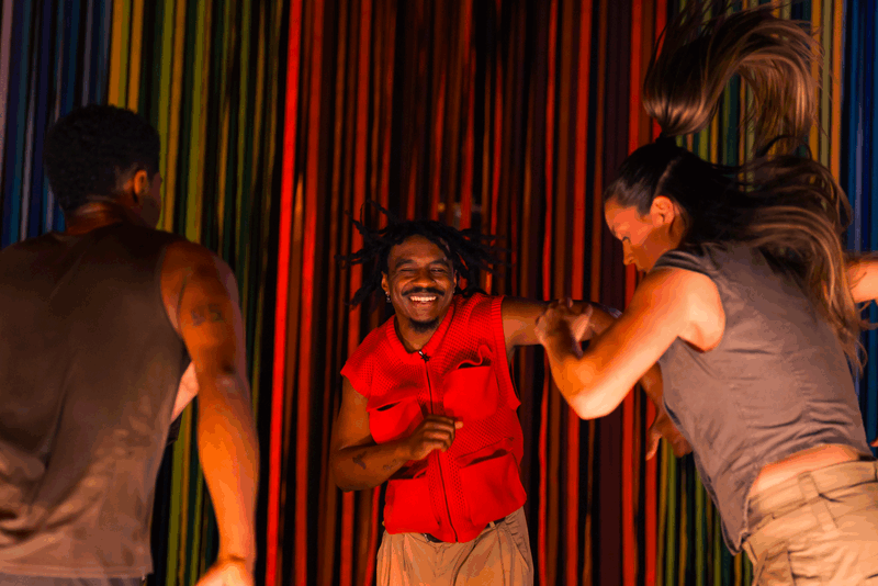 Vier dansers en een zangeres brengen een vertrouwde, cultureel doorleefde energie het podium op met de soort ritmes en bewegingen die je van huis uit kent, die in je lijf zitten nog vóór je ze kunt benoemen. Soca, konpa en Afrikaanse geluiden komen uit identiteit, herinneringen en community. Bewegingen ontstaan instinctief, gevoed door ritmes die resoneren met hun afkomst, herinneringen en levensenergie. Muziek wordt zichtbaar, voelbaar en tastbaar gemaakt, in licht, vibratie en pure fysieke expressie.
